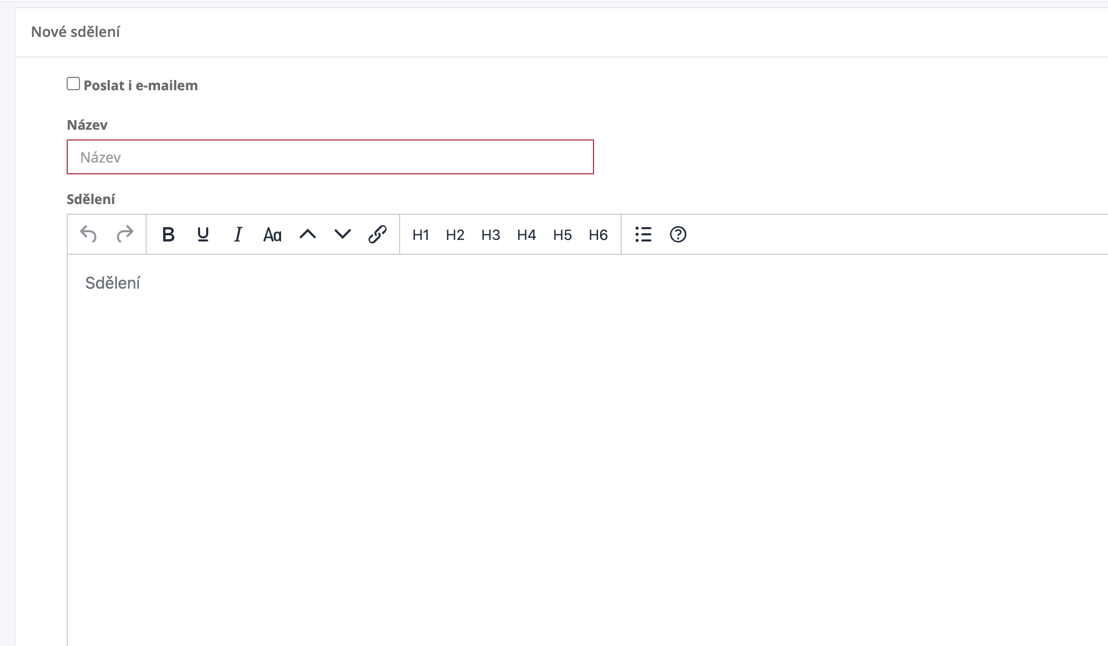 2. Ve sdělení klikněte při vytváření na tlačítko "poslat i e-mailem", sdělení se následně odešle na uživatele u kterých je vyplněn e-mail dle výběru v backoffice administraci.