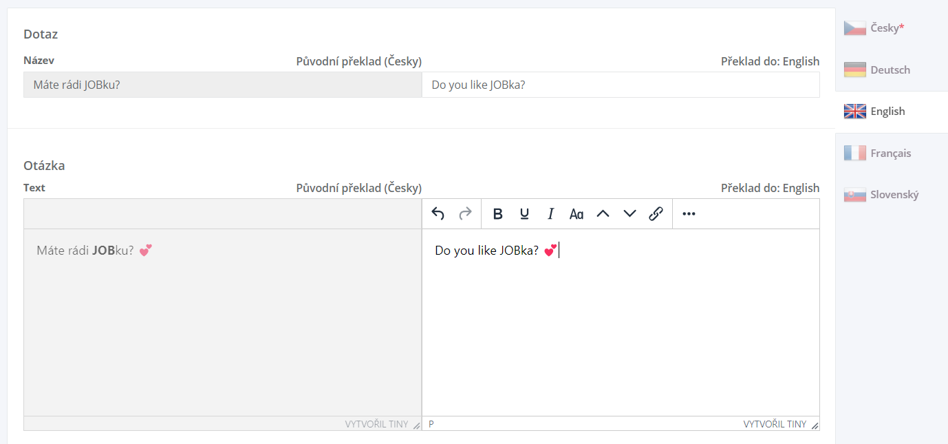 11. Překlady: Pro přidání překladů klikněte na ikonu vlajky v pravé části dotazníku.