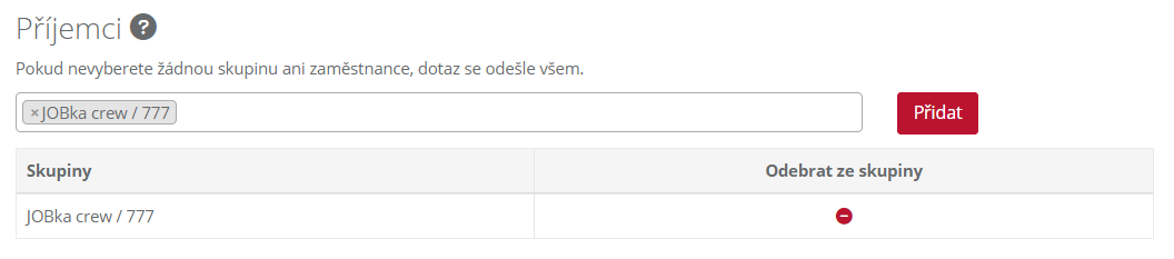 3.1 Pole Příjemci: Slouží k určení daných příjemců, tzn: pokud pole necháte prázdné, daná směrnice bude odeslána všem zaměstnancům, pokud kliknete do pole a vyberete pouze dané příjemce nebo skupiny, bude směrnice odeslána pouze jim. Pro přidání příjemce, je vždy nutné kliknout na pole Přidat.