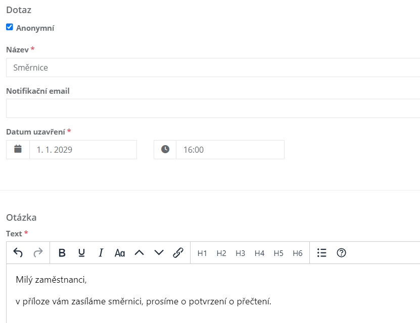 2.4 V poli ¨Notifikační email'' je možné vyplnit e-mailovou adresu, na kterou bude odeslán e-mail o uzavření expirace dané směrnice. Nastavení expirace je možné v poli "Datum uzavření".
