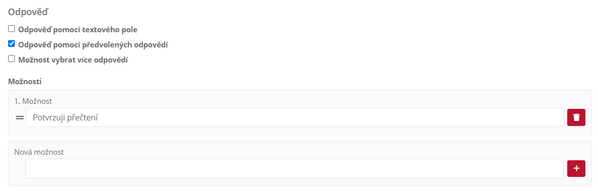 2.8 Následně zvolte typ odpovědi "Odpověď pomocí textového pole" (v mobilní aplikaci se zobrazí prázdné textové pole do kterého lze vypsat odpověď. "Odpověď pomocí předvolených odpovědí" (možnost vytvoření předem připravených odpovědí).