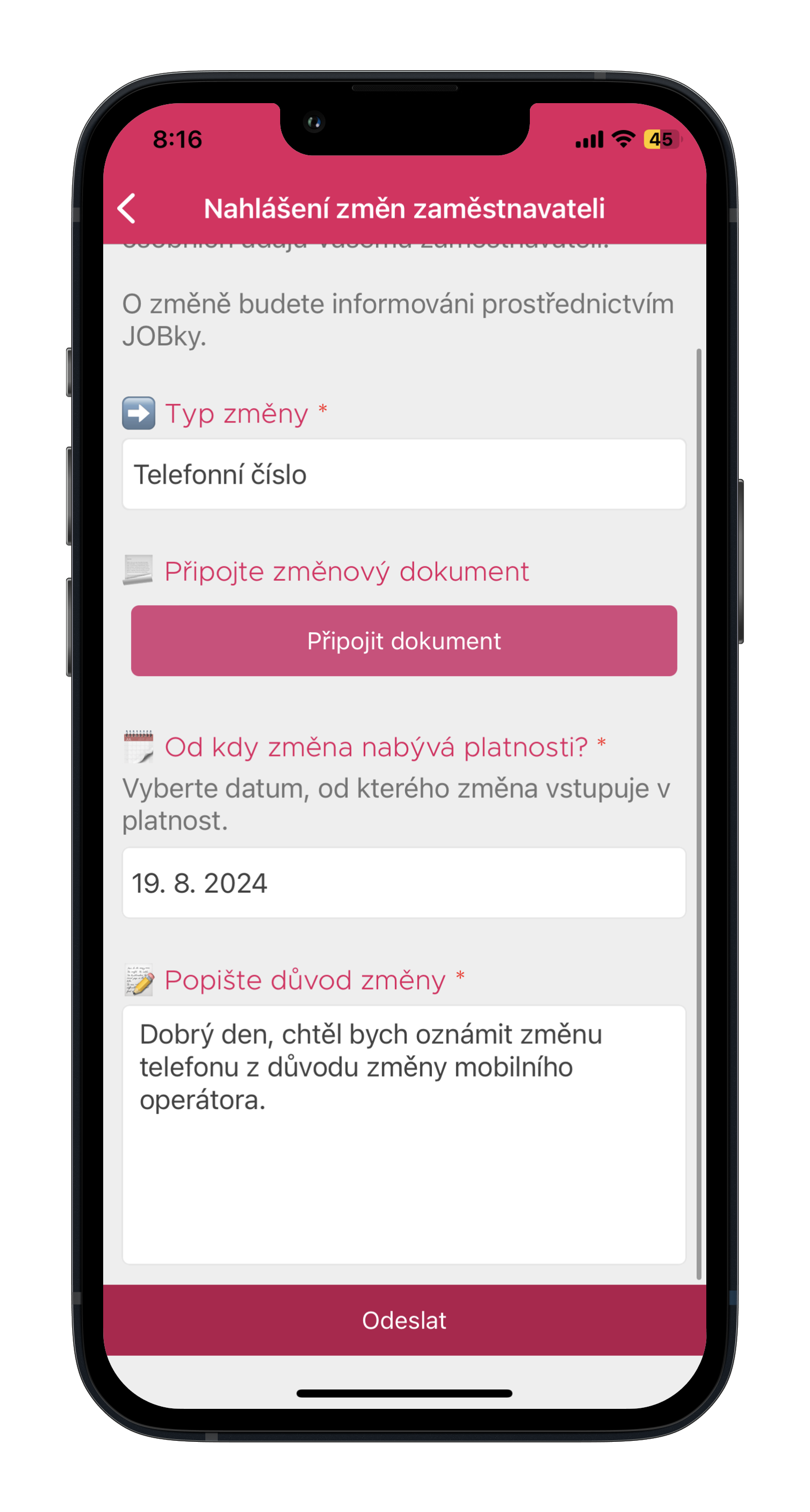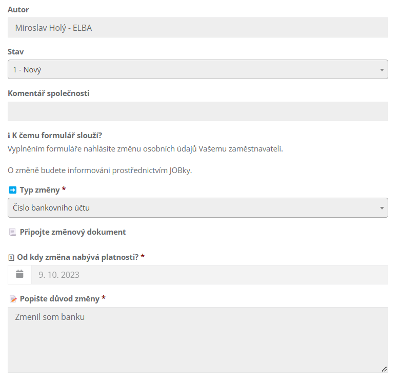 3. Zde se vám zobrazí formulář, kde vyplníte typ změny, datum od kdy změna nabývá platnost a důvod změny. Také lze připojit změnový dokument.