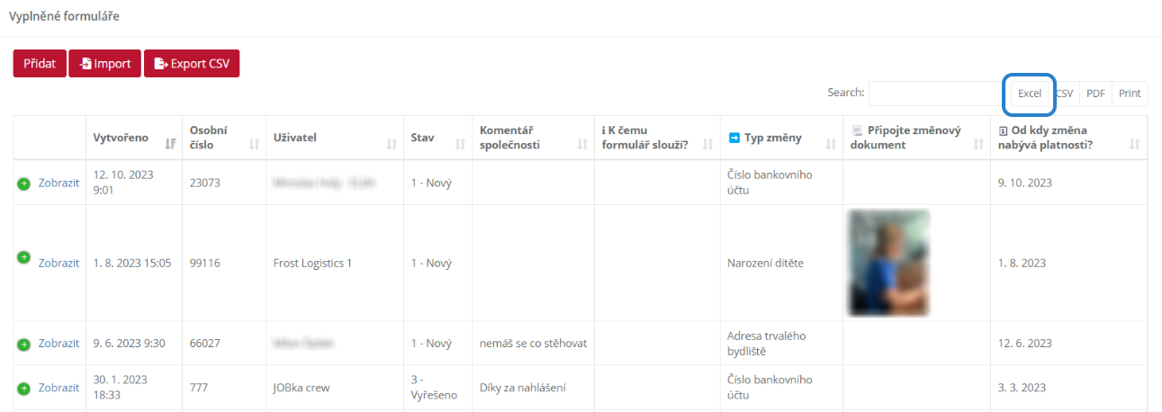 Zobrazí se vám všechna vyplněná hlášení, která můžete filtrovat pomocí vyhledávacího pole.