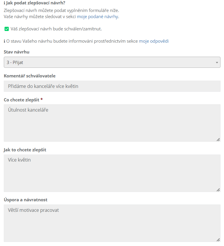 6. Poté změníte "Stav návrhu" a napíšete vlastní komentář k situaci. Komentář pro zaměstnance se pošle, pouze pokud změníte zlepšovací návrh do stavu "Zpracován", "Přijat" nebo "Zamítnut".