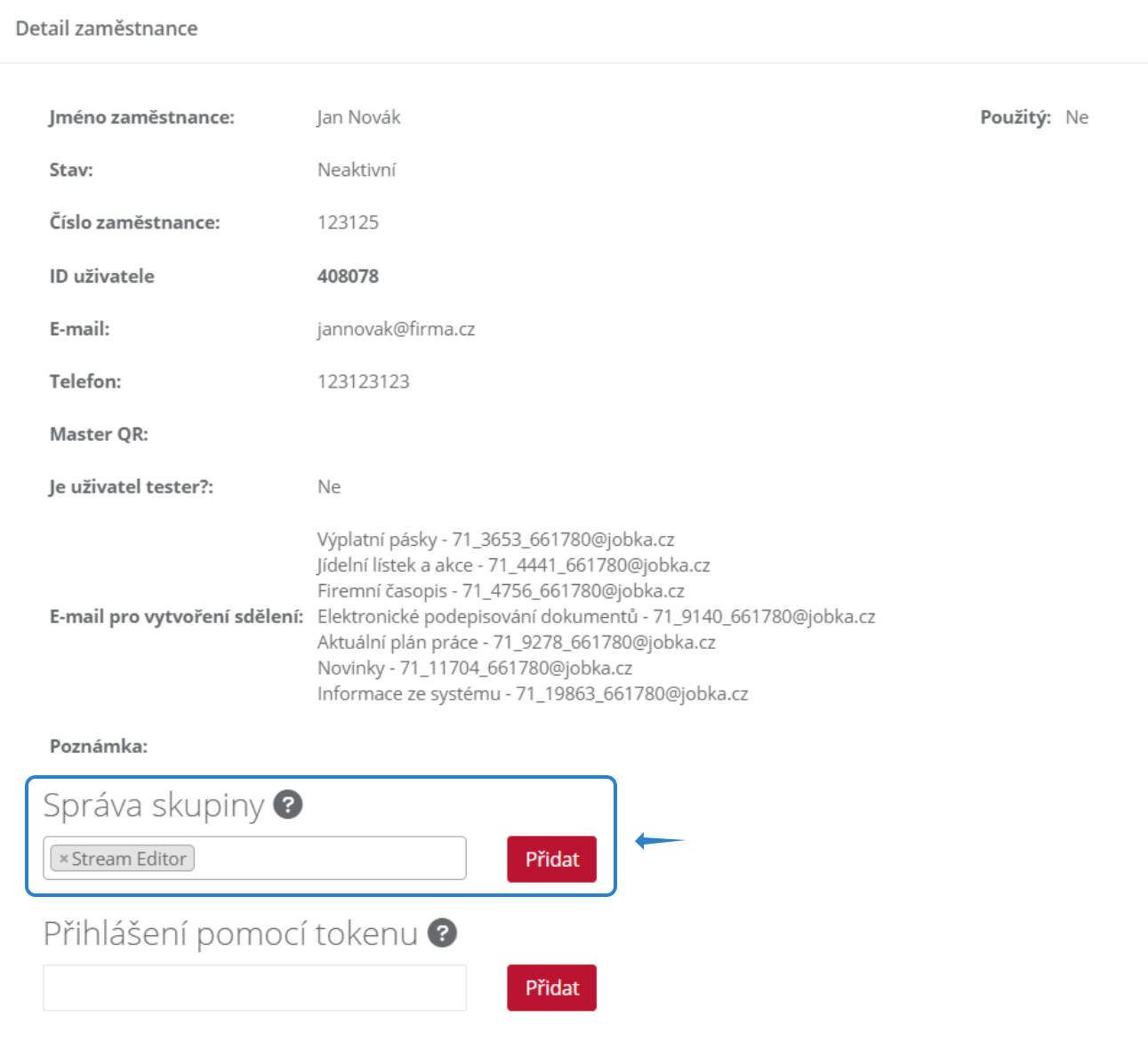 4. Ve spodní části vyberete pro jakou skupiny je zaměstnanec vytvořen. Skupinu přidáte pomocí tlačítka "Přidat".