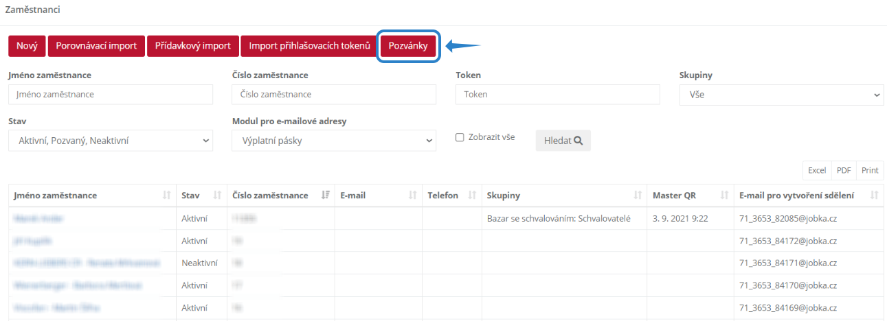 3. Zde můžete odesílat poznámky vybraným zaměstnancům pomocí jejich čísla nebo jména, nebo zaškrtnutých polí. Lze také filtrovat zaměstnance podle toho, jestli je pozvánka odeslána nebo ne. Poté co vyberete zaměstnance, stačí kliknout na tlačítko "Odeslat pozvánky".