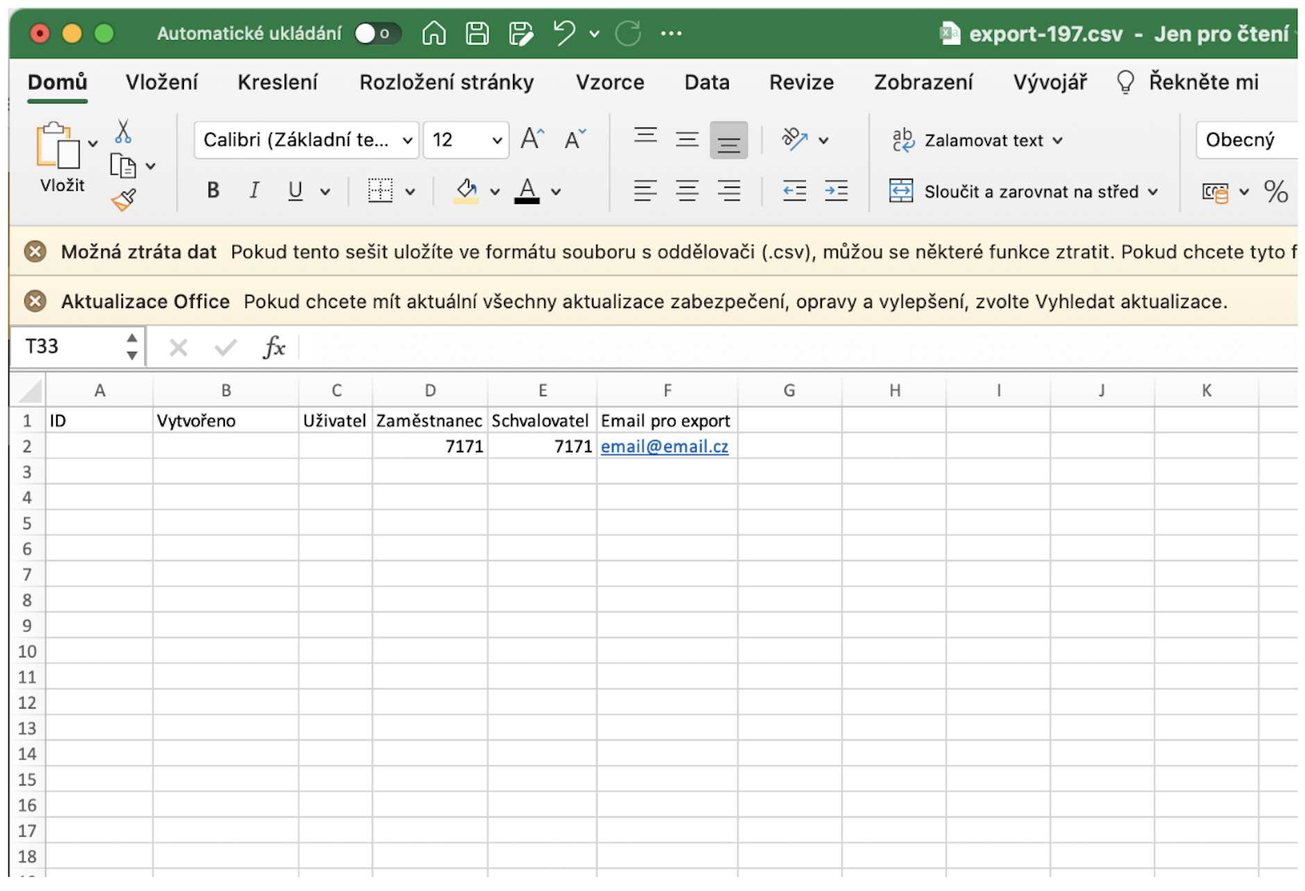 1. Kliknutím na tlačítko ''Export CSV'' se vám do úložiště stahování uloží šablona k vyplnění. V souboru je nutné vyplnit sloupce Zaměstnanec, Schvalovatel a Email pro export (sloupce A,B a C nechte prázdné). Po vyplnění soubor uložíte a klikem na tlačítko ''Import'' soubor nahrajete.