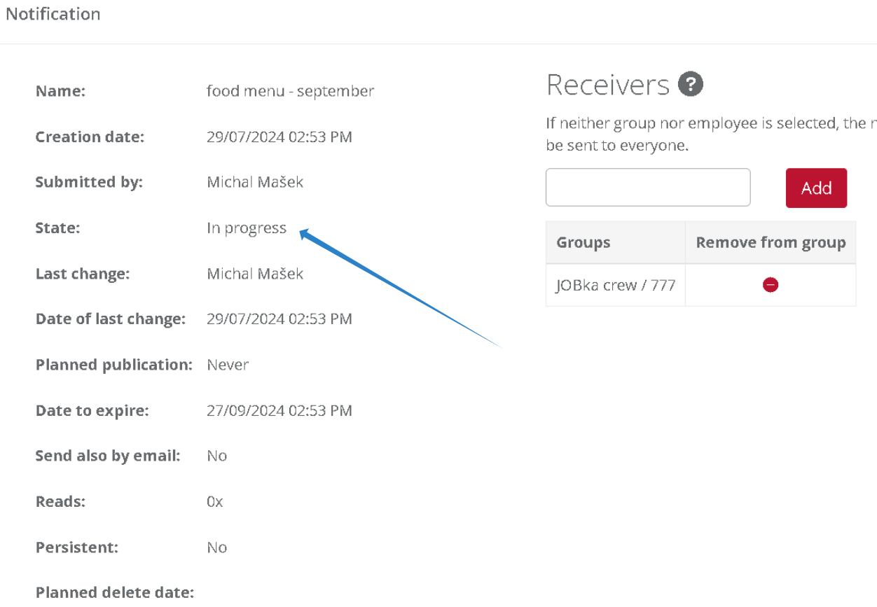 If you want to send the menu to a specific group or employee(s), click on the empty field, select the group or employee(s), and click "Add".