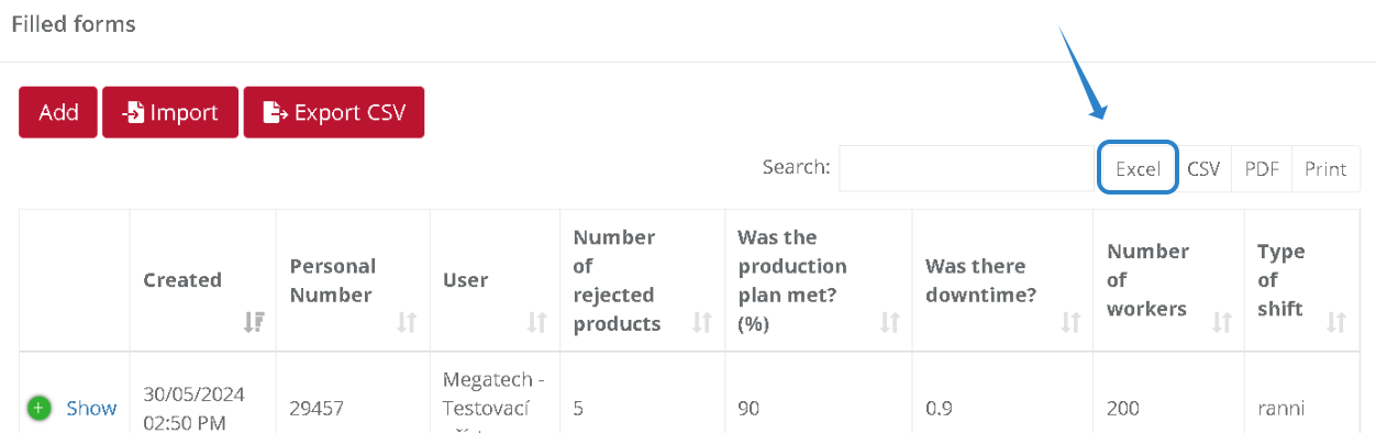 7. If you plan to edit your table and then upload the changes back, first save the Excel table using the "Export CSV" button. You can make any changes in the Excel table, but it is essential to keep the ID and Created columns filled out to ensure that your changes are saved correctly.
