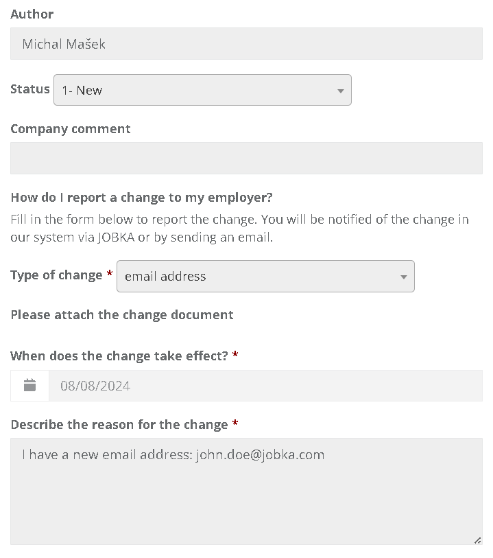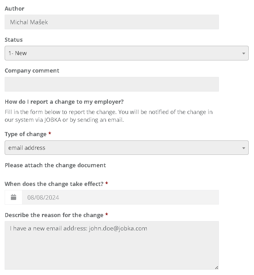 3. A form will appear where you can specify the type of change, the date the change takes effect, and the reason for the change. You can also attach a document related to the change.