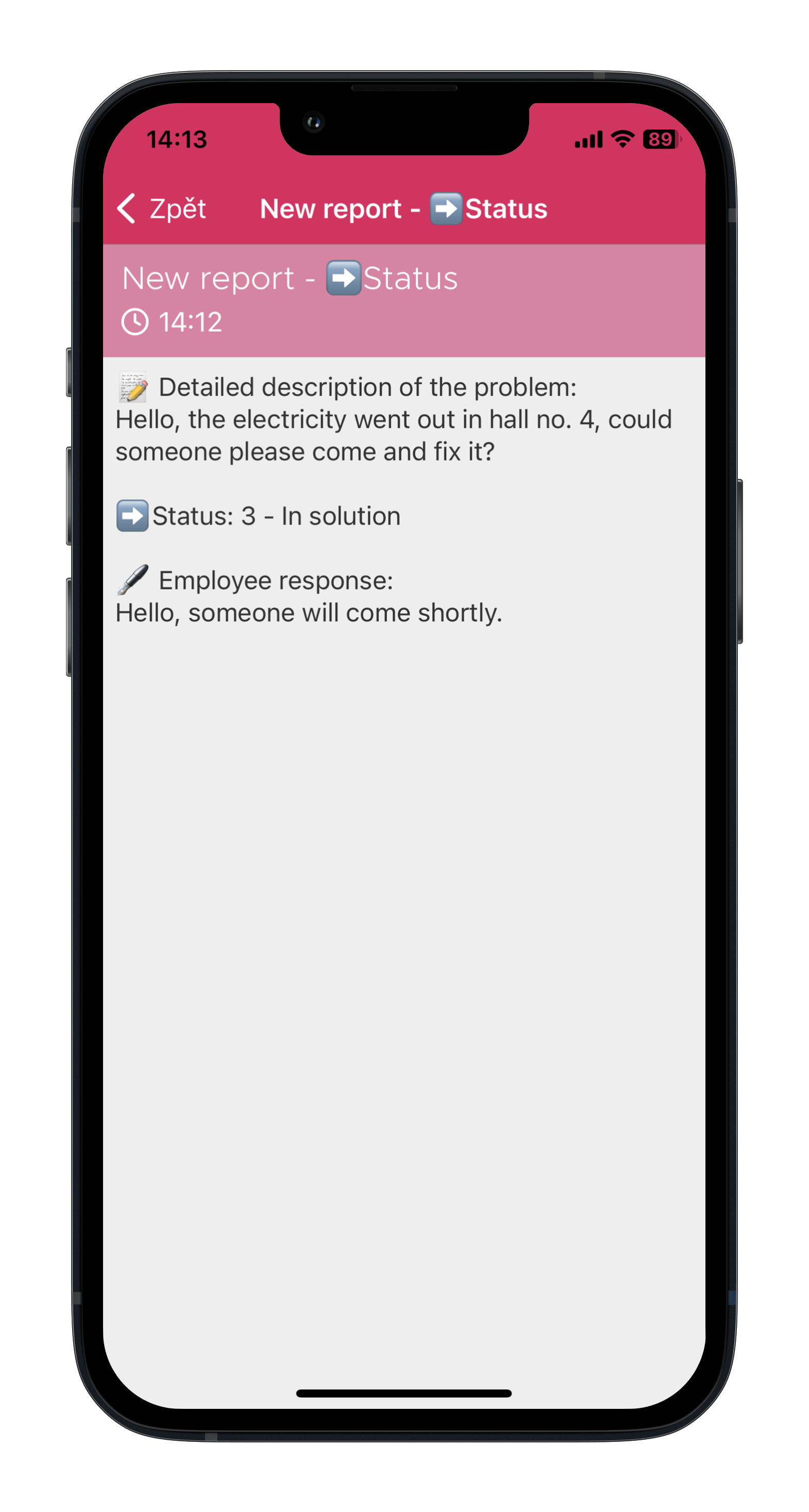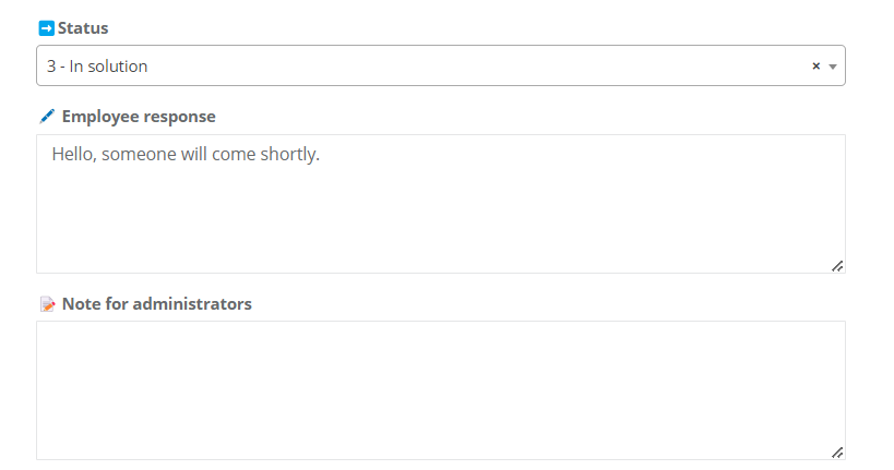 5. You will be directed to a form where you must specify the status of the report (so the employee receives a notification that a response has been sent) and write a response to the employee or a note for the administrators. You can freely edit the breakdown/incident details, change the priority of the issue, and also add, change, or remove a photo (with a maximum size of 10 MB). After making edits, click the "Update" button.