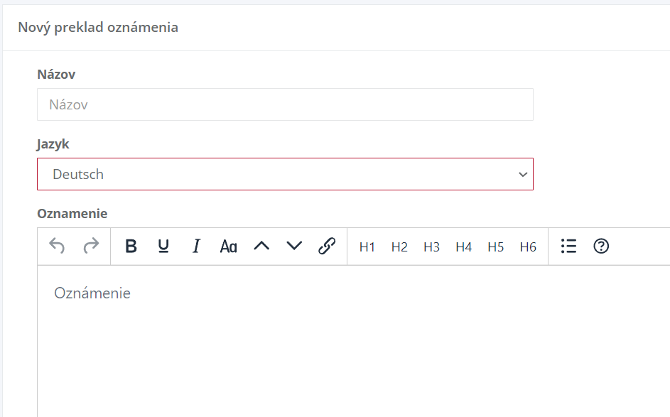 15. Potom zadáte znovu názov (vo vami vybranom jazyku), vyberiete jazyk v ktorom je napísaný a napíšete oznámenie vo vami vybranom jazyku.